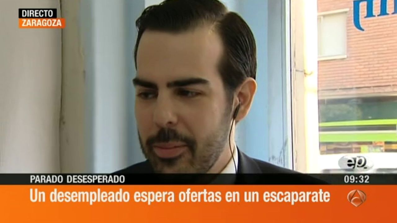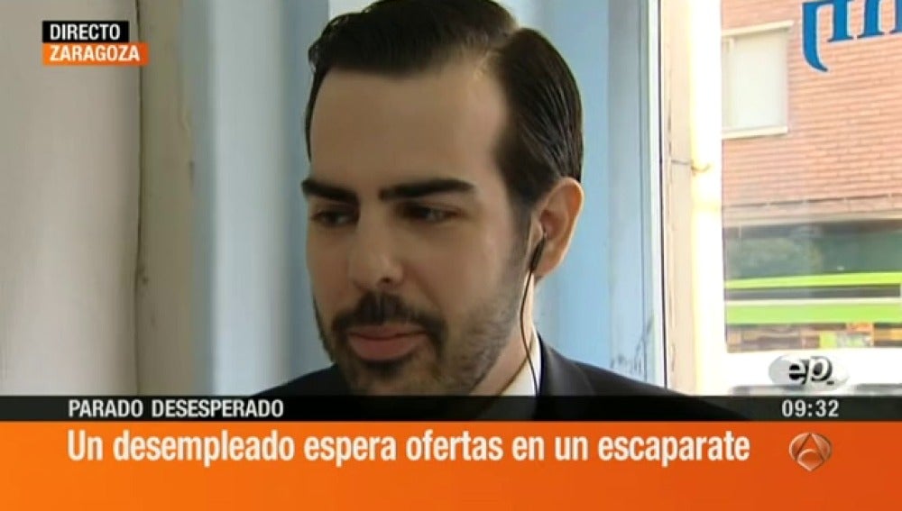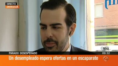 Francisco Javier Cebollero es un lincenciado en Economía por la Universidad de Zaragoza que está en paro y, ante las nulas perspectivas de encontrar empleo, ha decidido llevar la iniciativa y ponerse a buscar trabajo desde un escaparate en la calle.