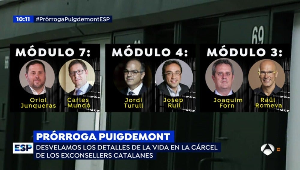Antena 3 » Programas » Espejo Público » Noticias PUIGDEMONT EN LIBERTAD CON MEDIDAS CAUTELARES Detalles de la vida en la cárcel de los exconsellers catalanes 'Espejo Público' detalla los detalles de la vida en la cárcel de los exconsellers catalanes. ¿Cómo transcurren los primeros días de los exconsellers encarcelados? Más sobre este tema: Oriol Junqueras Espejo Público Cataluña