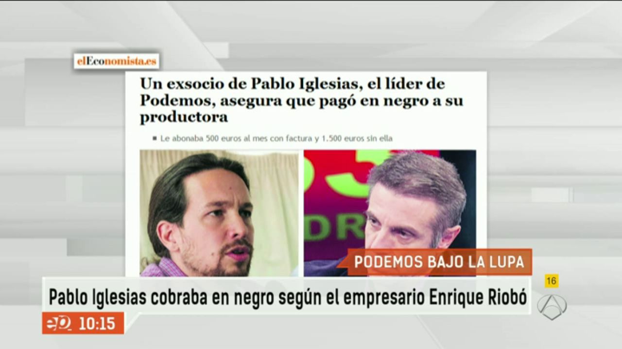 "El Economista" publica unos documentos que desvelan las irergularidades cometidas por Pablo Iglesias en el cobro de su productora. Al parecer, Iglesias exigía que le pagaran en negro. Enrique Riobó, fundador y propietario del Canal 33, tenía un acuerdo comercial para que el líder de Podemos emitiera su tertulia "La Tuerka" en su televisión. Un programa que presentaba y coordinaba. Riobó asegura que, entre finales de 2012 y principios de 2013, estuvo abonando 2.000 euros al mes a producciones CMI, la asociación cultural y sin ánimo de lucro que había creado Iglesias. De esa cantidad, 500 euros se pagaban con factura pero los 1500 restantes eran en B. "Pablo Iglesias me pidió cobrar en dinero negro y de este modo se le abonó. Ellos me exigieron que fuera así y me firmaron recibos en los dos primeros meses. Luego, con la confianza que había entre nosotros, ya ni siquiera le pedía los recibís", asegura Riobó.