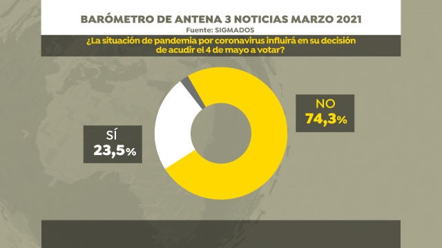 Las elecciones a la Asamblea de Madrid del próximo 4 de mayo son las segundas celebradas en plena pandemia del covid-19 después de las catalanas. Según datos de la encuesta de SigmaDos para Antena 3 Noticias a un 74,3% de la población la pandemia no le afectará en su decisión de ir a votar.