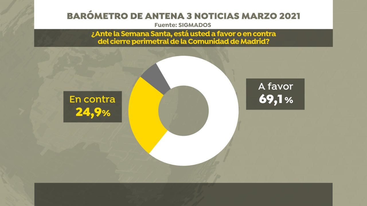 Según la encuesta elaborada por SigmaDos para Antena 3 Noticias el 69,1% de los encuestados se sitúa a favor del cierre perimetral de la Comunidad de Madrid ante la Semana Santa. Se trata de una opinión mayoritaria en todos los electorados, excepto el de Vox. Los votantes de la formación de Santiago Abascal se muestran a favor de esta medida en un 43,6%.