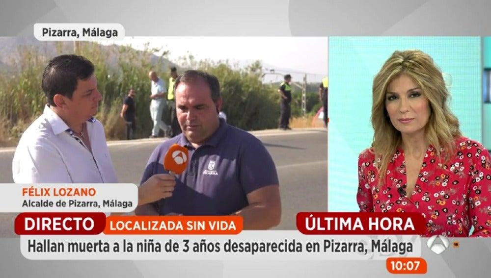 Hallan sin vida a la niña de 3 años desaparecida en Pizarra, Málaga. La han encontrado a 7km, entre Pizarra y Álora, después de una búsqueda activa de más de 600 personas, una batida de todo el pueblo durante toda la noche. 'Espejo Público' habla con Félix Lozano, alcalde de Pizarra, en el punto donde han encontrado a la niña.