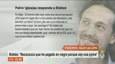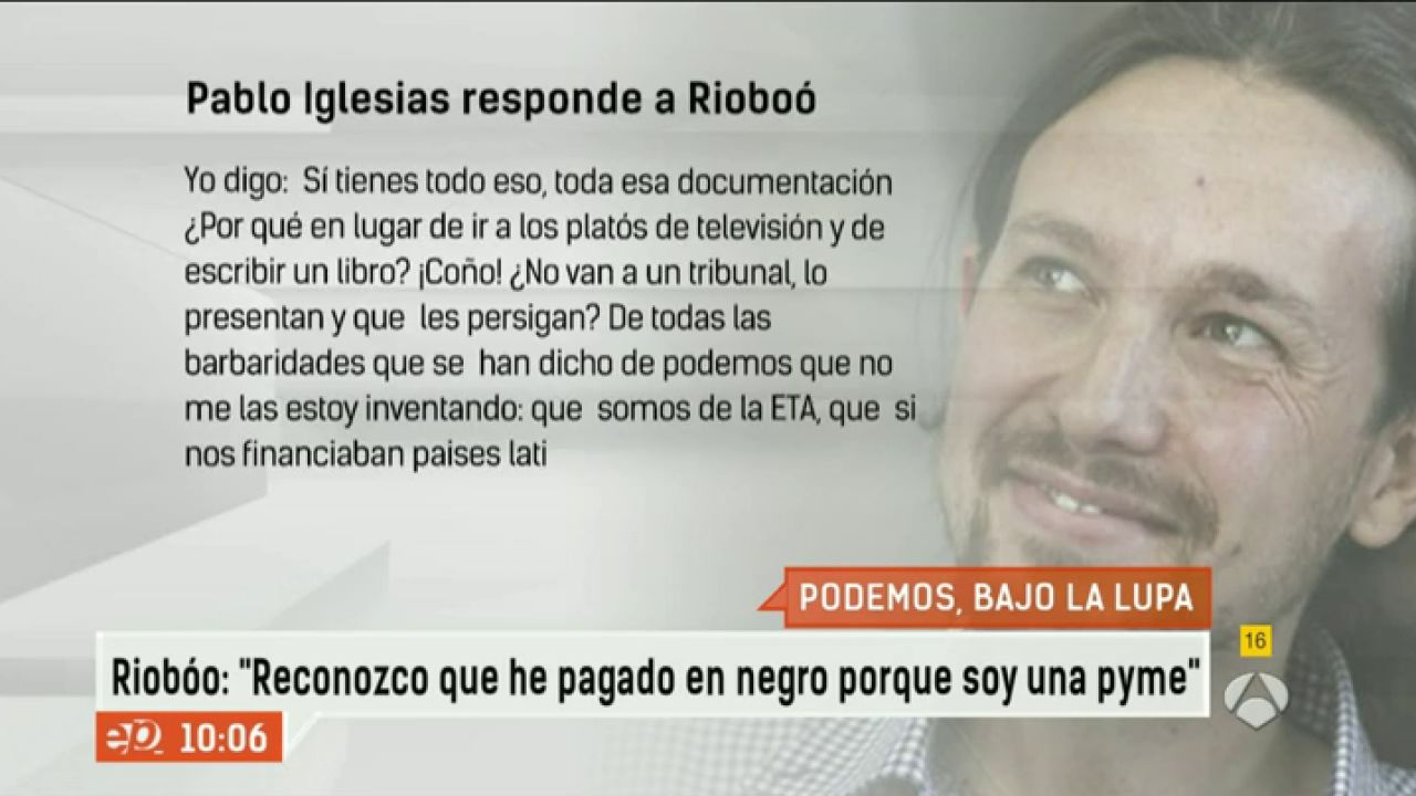 Pablo Iglesias está en el punto de mira tras las acusaciones de su antiguo socio en la televisión local canal 33, Enrique Riobóo, que le acusa de cobrar en negro el trabajo de su productora. "He visto a un Pablo Iglesias nervioso y crispado, aunque con una crispación medida que le interesaba a él", en referencia a la última entrevista del líder de Podemos en la televisión pública. Riobóo pide a Pablo Iglesias que le lleve a los tribunales si considera que le ha acusado de prácticas ilegales sin pruebas. "Los periodistas no estamos para denunciar a los políticos, sino para desvelar las irregularidades que conozcamos", dice Riobóo. "He visto al Pablo Iglesias más duro que sería un peligro para la libertad de prensa. Porque divide entre periodistas amigos de los que no lo son".
