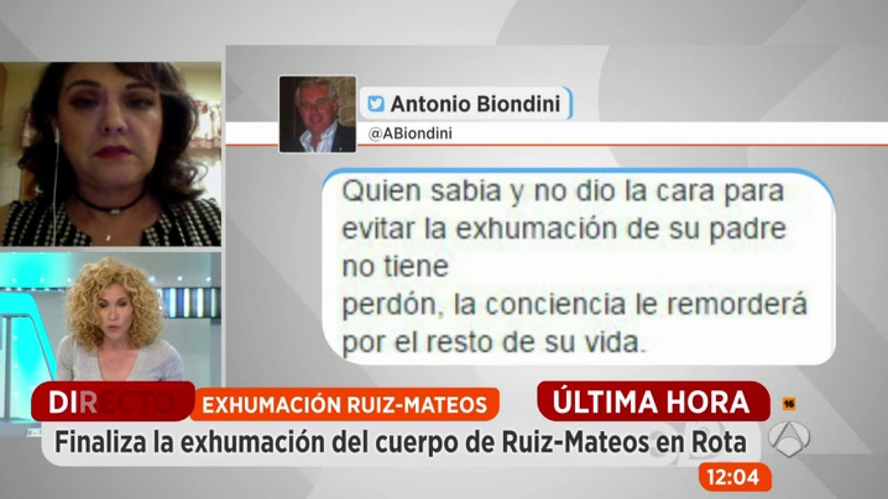 Ha finalizado la exhumación del cuerpo de Ruiz-Mateos en Rota (Cádiz). Espejo Público ha hablado con Miguel Torres, abogado de Adela Montes de Oca; la joven que ha instado el proceso solicitando una prueba de paternidad.