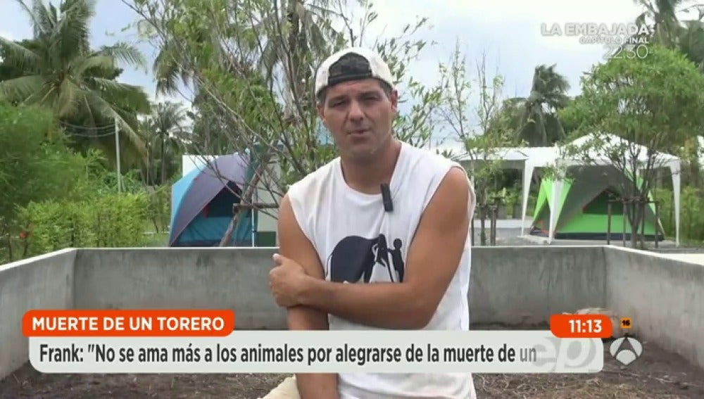 Frank Cuesta, "Frank de la jungla", es un famoso animalista, antitaurino, que no se alegra ni mucho menos por la muerte de un torero. Ha publicado un vídeo en el que critica la postura de muchas personas que se alegran de la muerte del joven Víctor Barrio. "Mme parece una auténtica salvajada lo que se pone en las redes sociales. No les hace más amante de los animales ni mejores personas. Da miedo".