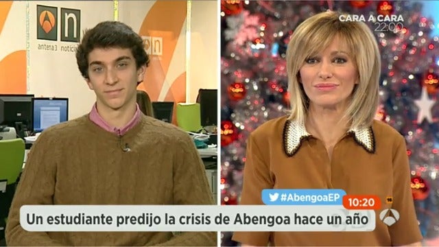 Un chico de 18 años predijo la crisis de Abengoa un año antes de que sucediera. Pepe Baltá es estudiante de Medicina y cuando estaba en el instituto hizo un trabajo sobre Abengoa vaticinando que entraría en concurso de acreedores y que sería expulsada del Ibex. Hemos hablado con él en Espejo Público. "No dije nada a esta empresa porque no tenían por qué hacerme caso, era una persona de 17 años y ya hay personas que se dedican especialmente a esto".