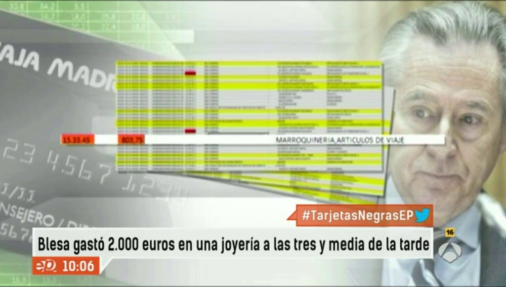 Si analizamos la documentación paso a paso no todos los gastos que se realizan dentro de lo que el juez considera horario laboral, podrían enmarcarse dentro del apartado de compras de trabajo. Por ejemplo, Miguel Blesa gastó 800 euros en artículos de viaje y maletas a las 3 y media de la tarde y casi 700 euros en unos prestigiosos grandes almacenes. Pero no sólo eso, El extracto de su black señala que acudió, dentro de lo que el juez considera horario laboral a una de las joyerías más prestigiosas de Madrid y gastó en ella más de 2000 euros. Un gasto poco relacionado con su labor profesional pero que es considerado correcto al producirse a las 3 y media de la tarde.
