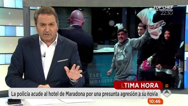 Maradona se encuentra en la capital de España con motivo del partido de Liga de Campeones que esta noche juegan el Real Madrid y el Nápoles, uno de los equipos con los que jugó en Europa durante su carrera futbolística. En la noche del lunes, protagonizó un enfrentamiento en el hotel con un periodista de la Cadena Cope, según difundieron ayer varios medios de comunicación.