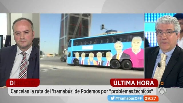 La salida del llamado 'tramabús' de Podemos no ha dejado indiferente a ningún partido político. El director de El Independiente, Casimiro García- Abadillo asegura que el partido que lidera Pablo Iglesias tenía previsto que el polémico autobús saliera mucho antes. Sin embargo, el dueño de la empresa de transportes con la que habían contratado el servicio se echó atrás en el último momento. Según García- Abadillo el motivo era que el empresario era amigo de Aznar.