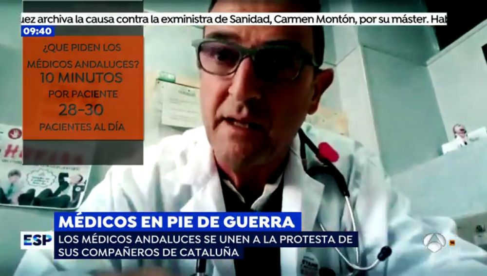 El sector de los médicos de familia está en pie de guerra para reivindicar mejoras en las condiciones laborales. En Andalucía los facultativos solicitan más tiempo para atender a cada paciente. Es el caso de Carlos Bautista, médico de atención primaria de un centro de salud de Málaga. Dice que tiene cada día una lista de pacientes que supera las 60 personas y que apenas puede pasar con cada uno de ellos cuatro o cinco minutos. Solicita un mínimo de 10 minutos para poder dedicar tiempo al enfermo. "No nos dejan ni acceder a determinadas pruebas diagnósticas, esto es un caos insoportables", lamenta.