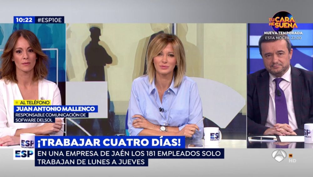 La empresa 'Software del sol' (Jaén) está formada por 181 empleados y en 2019 la dirección ejecutiva de la empresa planteó la idea de trabajar solo cuatro días a la semana. En Espejo Público hemos hablado con Juan Antonio Mallenco, responsable de comunicación de la empresa y nos ha contado todos los detalles.