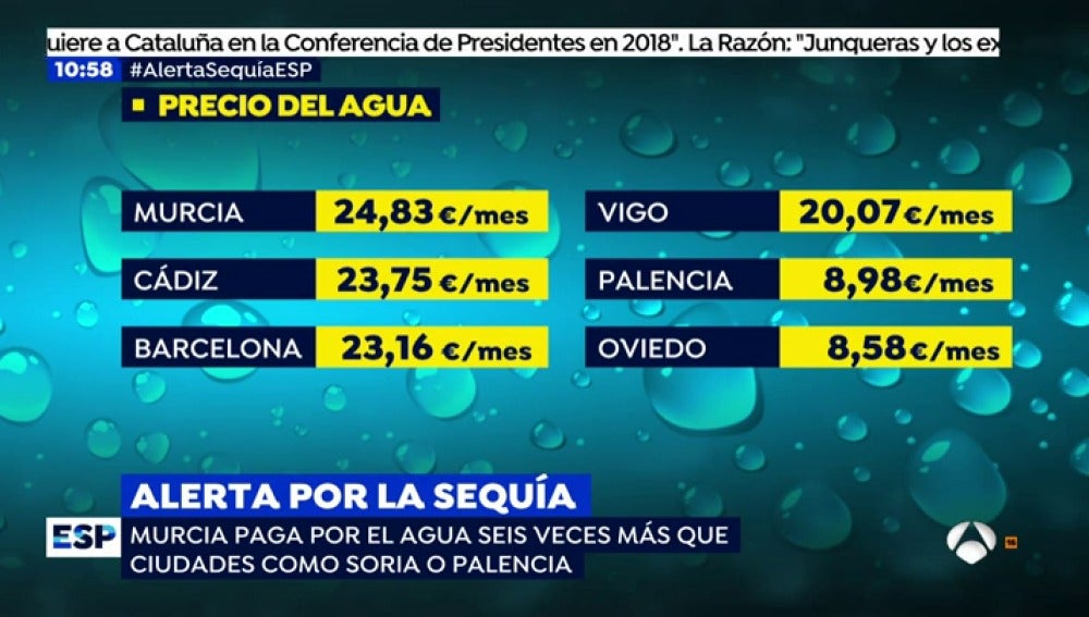 Murcia paga por el agua seis veces más que ciudades como Soria o Palencia. Elena, de Murcia, cuenta que solo pagan 25 euros por una factura trimestral de agua. Irene, de Galicia, se queja de que paga un canon fijo por el agua aunque no consuma.