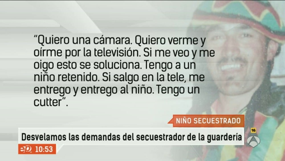 "Quiero una cámara. Quiero verme y oírme por la televisión. Si me veo y me oigo esto se soluciona. Tengo a un niño retenido. Si salgo en la tele, me entrego y entrego al niño. Tengo un cutter", estas fueron sus primeras demandas cuando llegó la Guardia Civil. Lejos de amedrentarse, el secuestrador íba perdiendo la paciencia según avanzaba la mañana. "Estáis tardando mucho. Todo lo que pase es culpa vuestra. Se os está yendo de las manos. No quiero hablar con ningún negociador. Si entra alguien más juro que la lío".