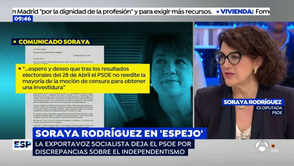 Soraya Rodríguez ha comunicado a las filas del PSOE que abandona el partido por sus discrepancias con el trato al independentismo. Asegura que ha tomado una decisión (dejar el PSOE) pero desde entonces no ha tomado ninguna más sobre su devenir político.