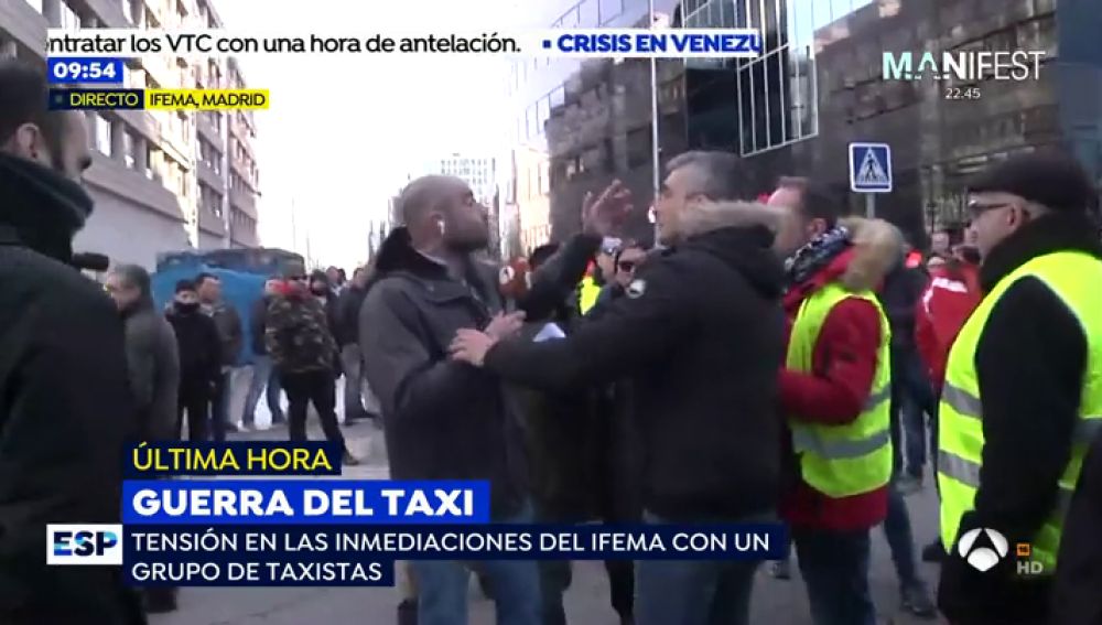 El reportero de 'Espejo Público' Raúl García se encontraba en las inmediaciones de Ifema para informar sobre la nueva jornada de huelga de taxistas. En un momento de la concentración un conductor de VTC intentaba entrar en la zona. Los taxistas le echaban del lugar de forma violenta pero al ver la aparición de la prensa rebajaban el tono de las protestas.
