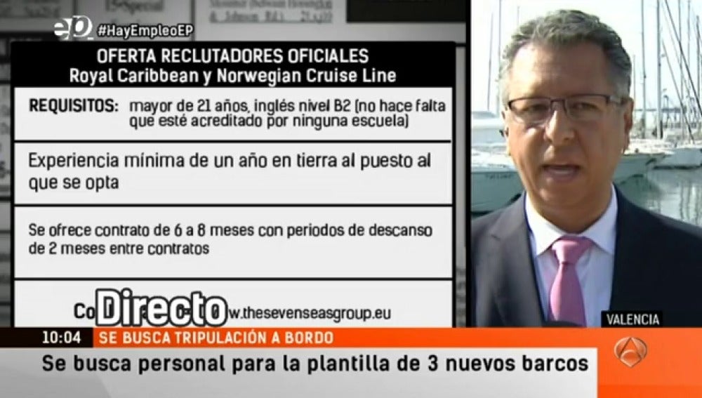 Dos importantes navieras ofrecen 500 puestos de trabajo para cubrir puestos en tres cruceros que surcarán los mares este verano. Se ofrece un contrato de 6 y 8 meses con periodos de descanso de 2 meses entre contratos. Los requisitos son ser meyor de 21 años, un aceptable nivel de inglés y una experiencia mínima de un año en tierra al puesto al que se opta. Más información en www.thesevenseasgroup.eu