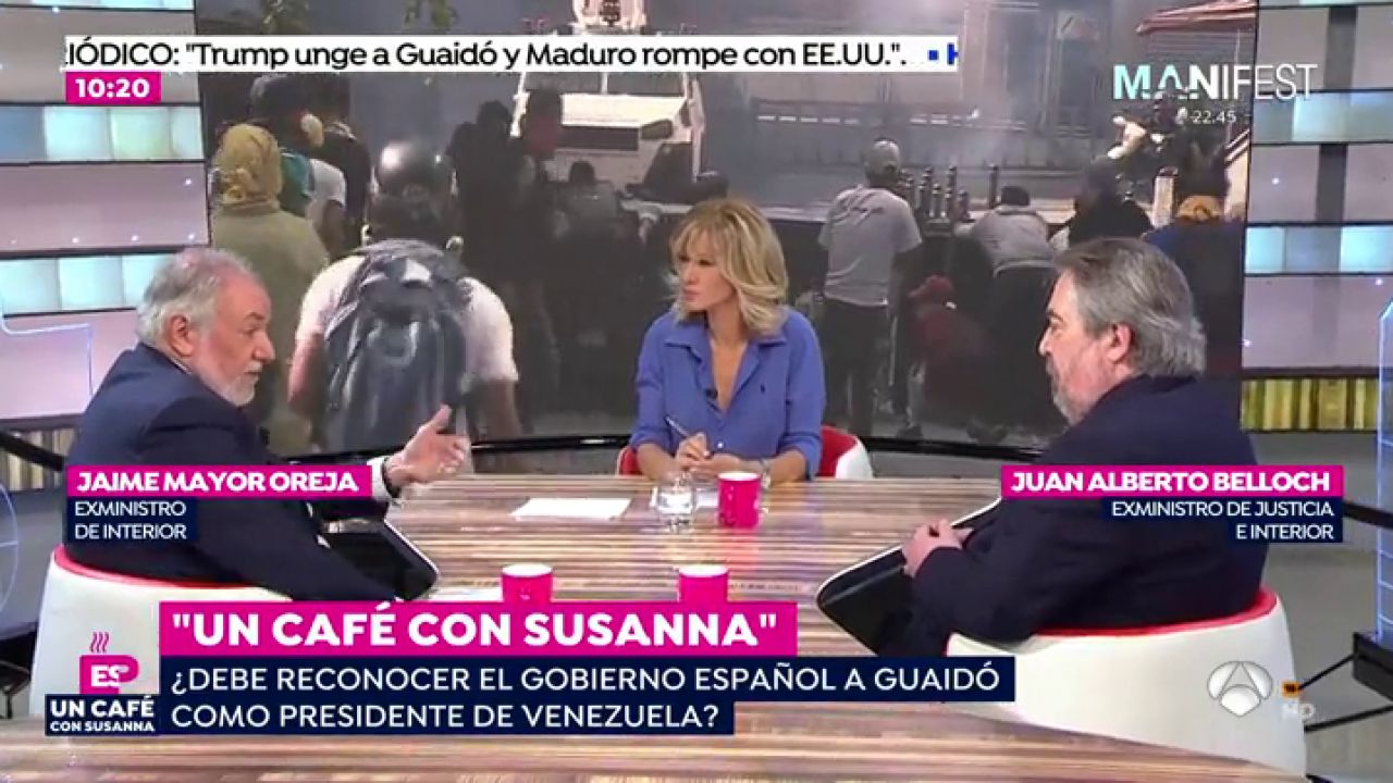 Susanna Griso ha entrevistado a quienes fueran ministros de interior Jaime Mayor Oreja y Juan Alberto Belloch. El segundo considera que es prioritario que la Unión Europea se pronuncie sobre la autoproclamación de Juan Guaidó como nuevo presidente de Venezuela.
