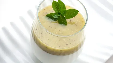 Reparte el puré sobre los 4 vasos y sirve. Adórnalos con unas hojas de menta.