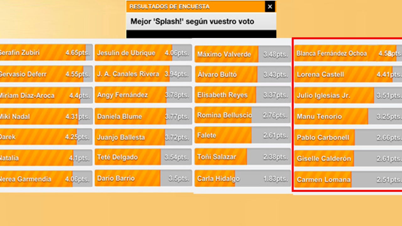 Les siguen Lorena Castell, con 4,41 puntos, Miki Nadal con 4,31 puntos, Darek con 4,25 puntos, y Natalia con 4,1. Los más rezagados siguen siendo Carla Hidalgo, con 1,83 puntos, y Toñi Salazar, que no han convencido a los usuarios con sus saltos "de pie" y son las únicas que no llegas ni a la mitad de los puntos máximos (2,5).