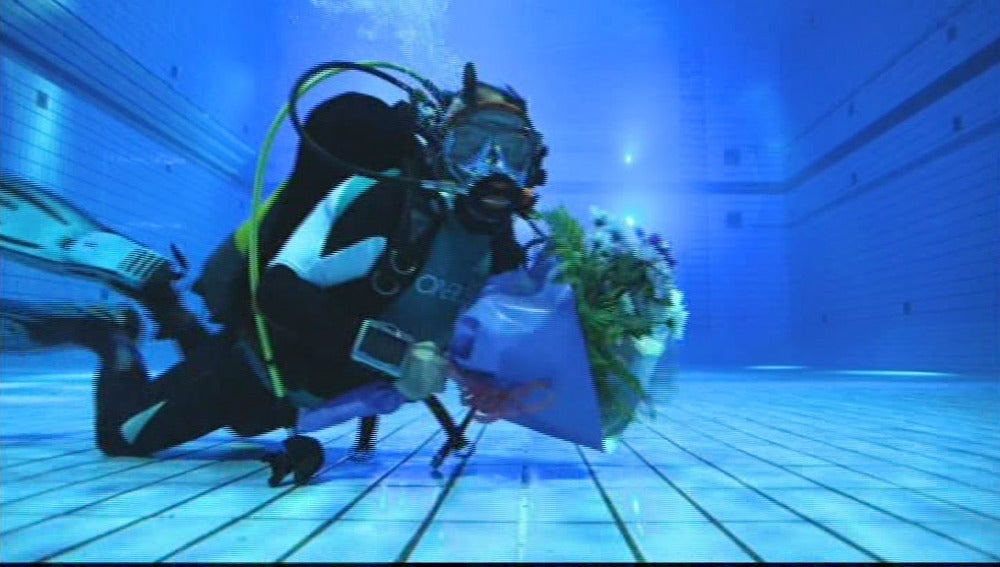 El buzo de Splash! Famosos al agua ya ha declarado su amor por la actriz, en los cuartos de final conquistó el corazón de Daniela con unos carteles en la que le decía lo que sentía, en esta ocasión el buzo ha querido sorprender a la sexy concursante con un ramo de flores. ¿Comenzarán un idilio bajo el agua?