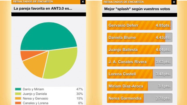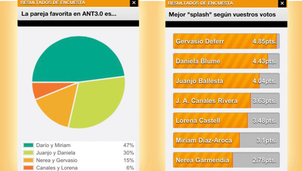 Darío Barrio y Miriam Díaz-Aroca han sido la pareja que ha realizado el mejor salto sincronizado del quinto programa de 'Splash! Famosos al agua', según los usuarios de la aplicación ANT3.0. El cocinero y la actriz han convencido al 47% de los encuestados, una abrumadora mayoría si lo comparamos con la segunda pareja más votada, la formada por Juanjo Ballesta y Daniela Blume, quienes han recibido el apoyo de un 30% de los usuarios.