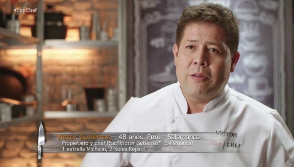 Víctor Gutiérrez es propietario y chef del Restaurante Víctor Gutiérrez en Salamanca con 1 Estrella Michelin y 2 Soles Repsol. Ha sido elegido el mejor restaurante de Castilla y León 2015. La trayectoria gastronómica de este chef de origen peruano afincado en Salamanca, comienza en un humilde restaurante familiar donde ejerció las labores más básicas; poco a poco y gracias a su esfuerzo y tesón, fue creciendo y, tras pasar por restaurantes de prestigio en Castilla León, decidió arriesgar y montar su propio negocio, Víctor Gutiérrez. Su talento y valentía se vieron recompensados dos años después con la Estrella Michelin, que lleva manteniendo durante 13 años. Afirma que su estilo de cocina aúna su alma española, su corazón peruano, y matices del mundo. Fue chef invitado durante la segunda temporada de 'Top Chef', pero en esta ocasión quiere ejercer como concursante y luchar por alzarse vencedor.