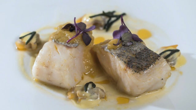 Manu Núñez elabora el plato de 'Caldeirada de merluza y kakis': Disponemos en el fondo del plato la crema de hinojo. Colocamos la merluza encima. Salseamos con la caldeirada de kaki, y disponemos alrededor unos berberechos recién abiertos y napados con la mayonesa cítrica y brotes de alga codium.