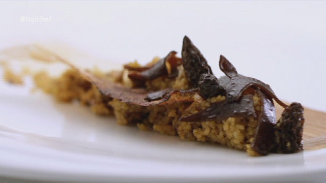 Dar un brochazo con la salsa clara en el fondo del plato y seguidos los otros dos colores. Degradarlos con otra brocha.Poner una franja de cuscús con las setas bien puestas, y encima el crujiente.