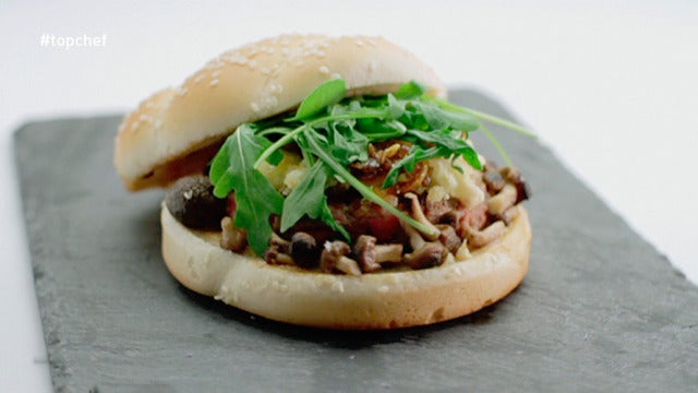 Tostar el pan de la hamburguesa y untarle la salsa en las dos caras. Poner encima la hamburguesa y, sobre ella, el queso de cabra. Las setas, la rodajas de kumquats y encima la rúcula.
