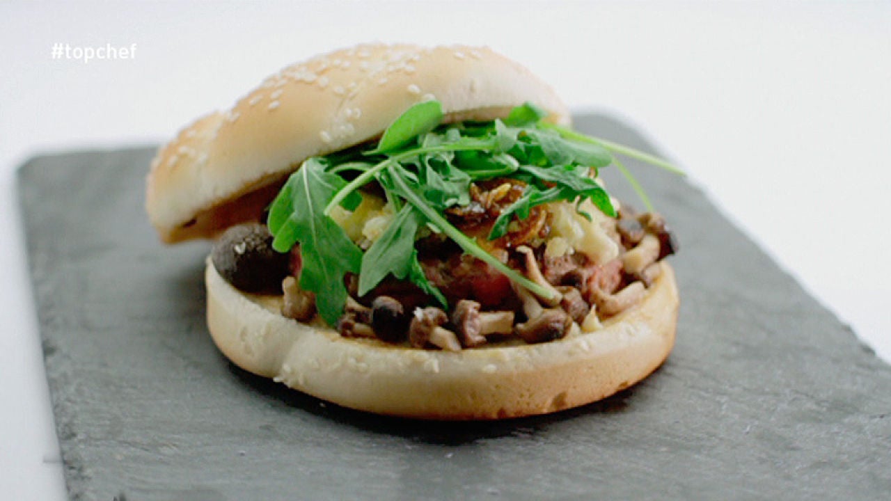 Poner encima la hamburguesa y, sobre ella, el queso de cabra.