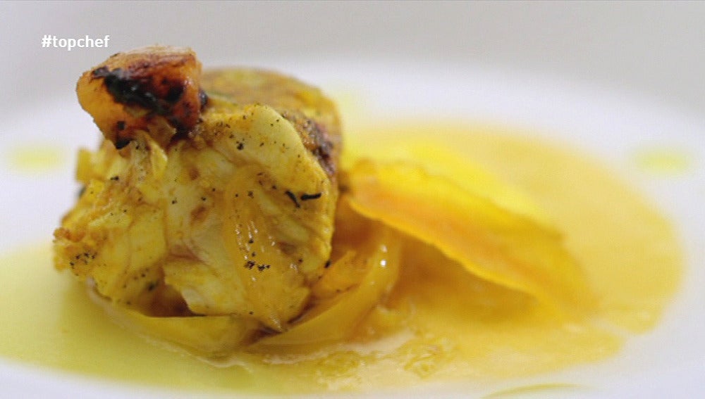 Se hace un enrollado con los pimientos y encima se coloca un poco de la crema de limón y el dado de pollo.Se acompaña de las 2 sopas, una por cada lado.Encima del pollo se pone el melocotón tatin, y se acompaña de maíz y orejones picados.Finalmente decoramos con los pétalos de pensamiento.