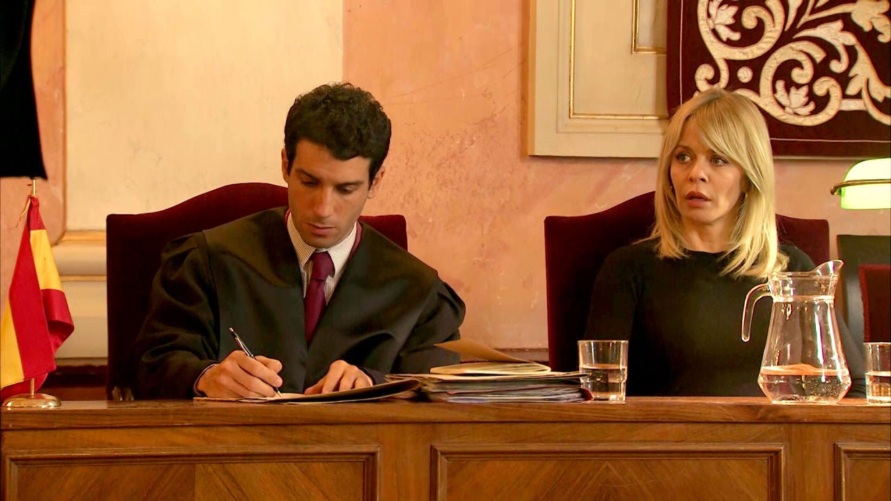 Almudena Pardo testifica en el juicio contra Charo Ponce. Almudena es una testigo comprada por Ortega para declarar en contra de Charo y acusarla de proxeneta. Parece que su testimonio es aceptado por el juez ante la impotencia y la rabia de Charo que le grita mentirosa.