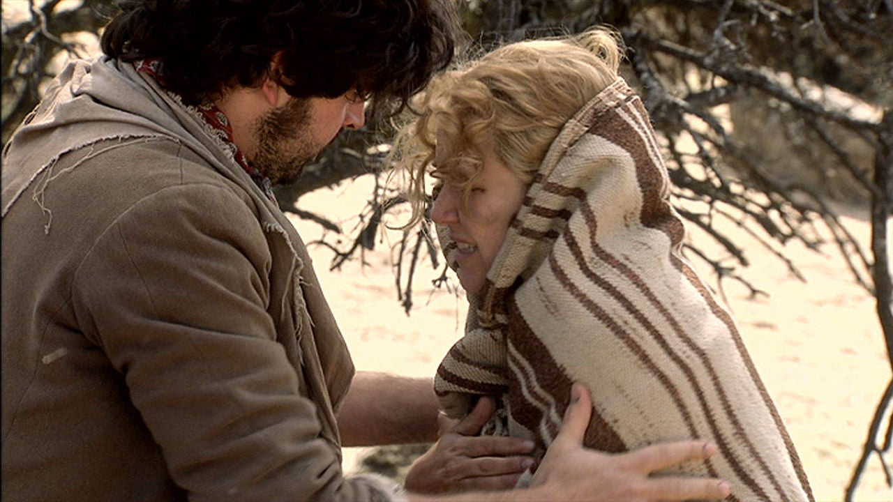 Chato encuentra a Clara medio muerta en el monte y la lleva a las cuevas para salvarle la vida.